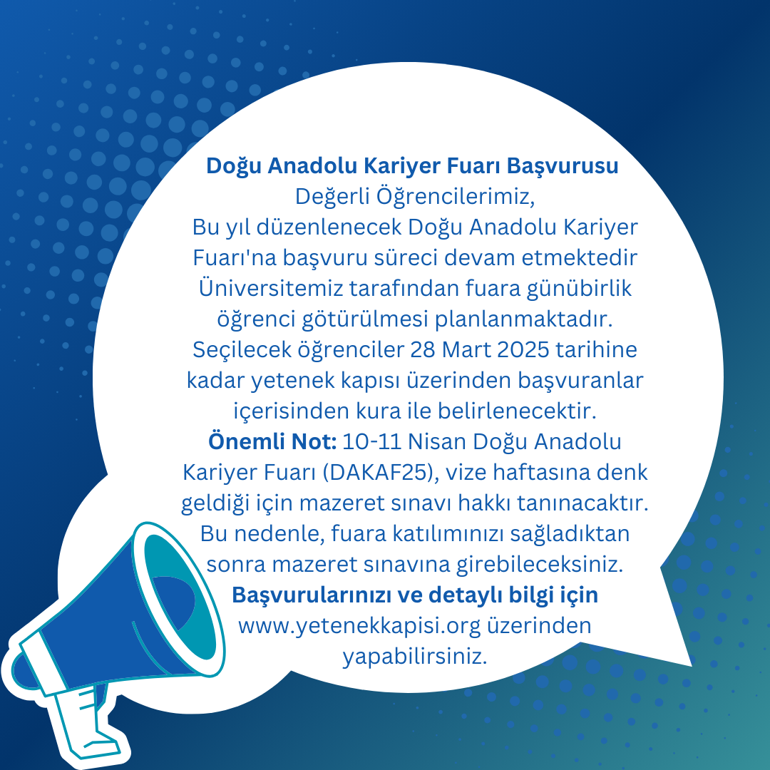 Önemli Not: 10-11 Nisan Doğu Anadolu Kariyer Fuarı (DAKAF25), vize haftasına denk geldiği için mazeret sınavı hakkı tanınacaktır. Bu nedenle, fuara katılımınızı sağladıktan sonra mazeret sınavına girebileceksiniz.