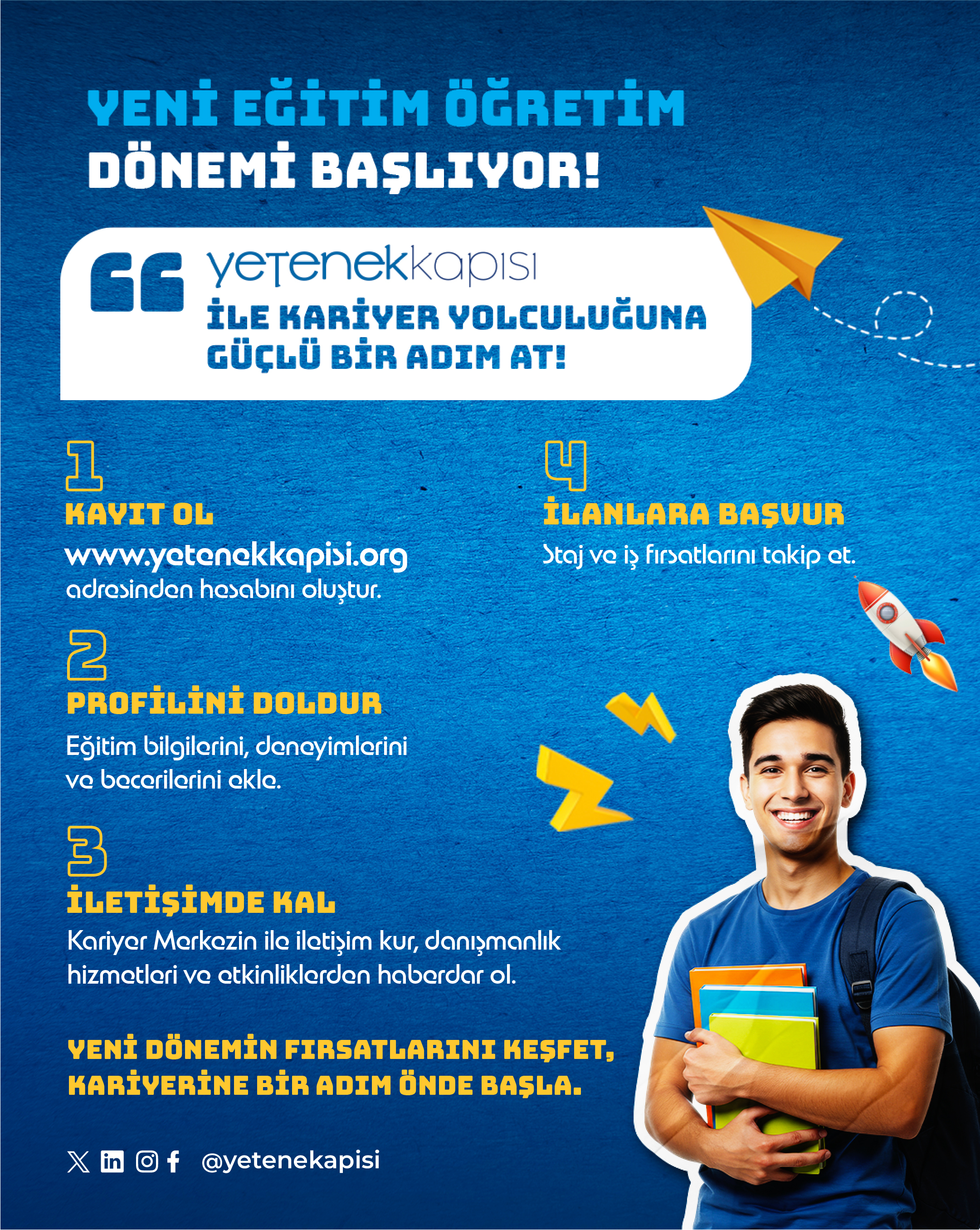 Genç üniversiteli! #YetenekKapısı ile kariyer etkinliklerinden haberdar olabilir, danışmanlık hizmetinden faydalanabilir, iş/staj ilanlarını takip edebilirsin. Profilini oluşturmaya hemen başla. 🤓