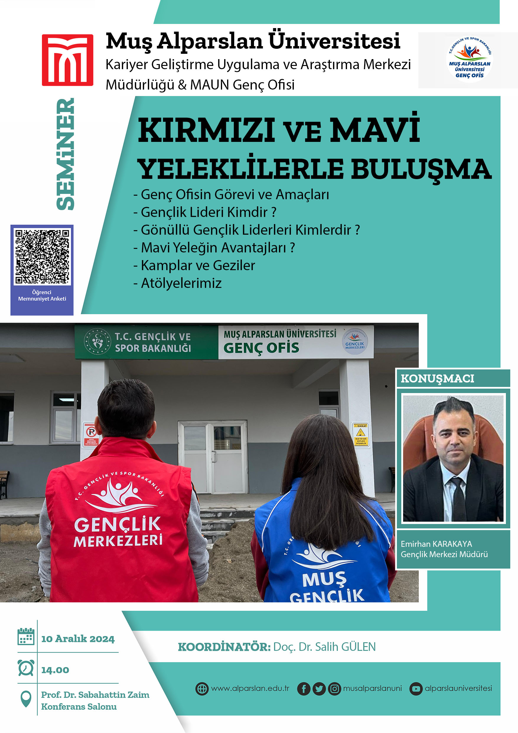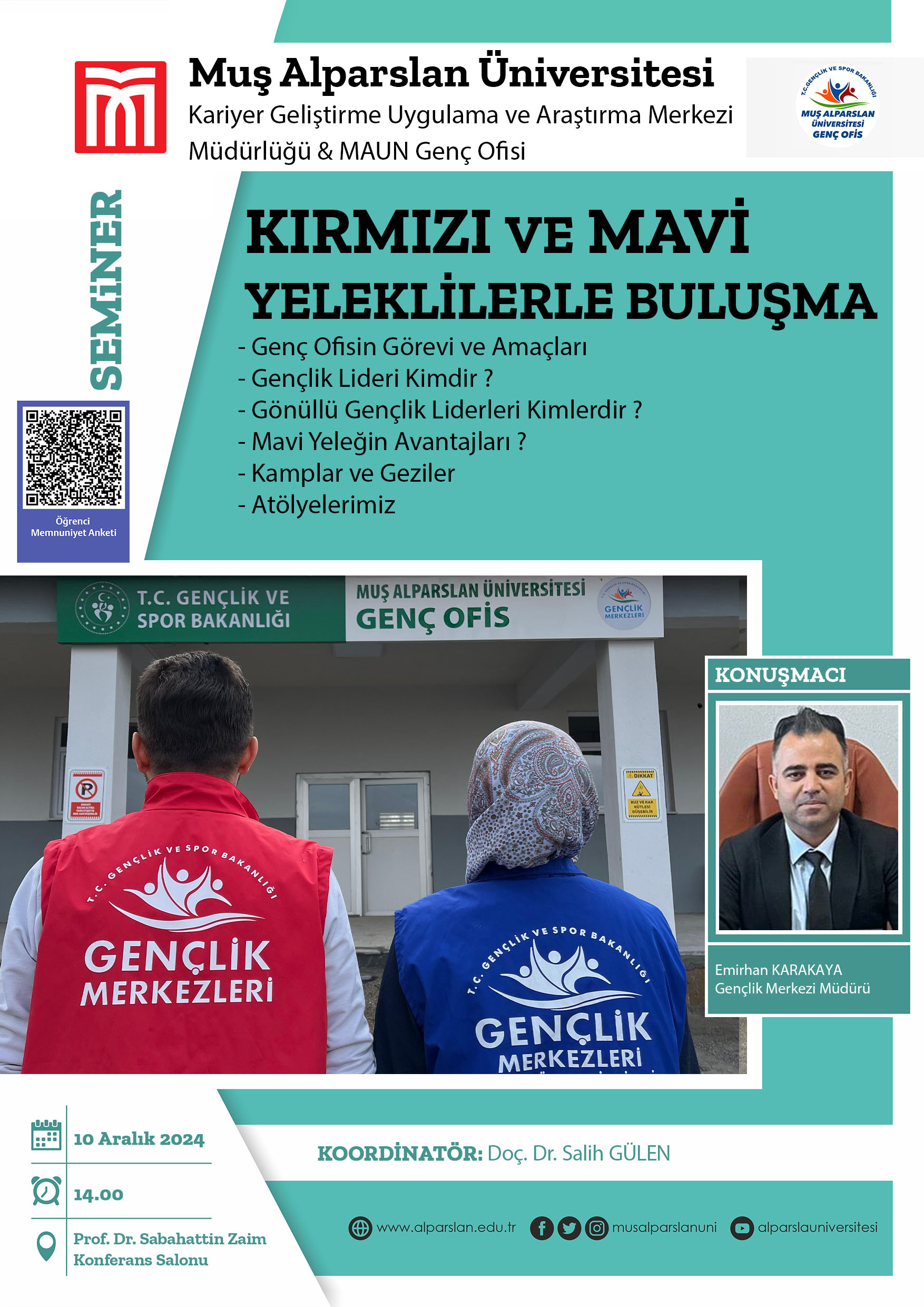Üniversitemiz Kariyer Geliştirme Uygulama ve Araştırma Merkezi (KARGEM) ile MAUN Genç Ofisi iş birliğiyle, KARGEM Müdürü Doç. Dr. Salih Gülen’in koordinatörlüğünde “Kırmızı ve Mavi Yeleklilerle Buluşma” başlıklı bir seminer gerçekleştirildi.