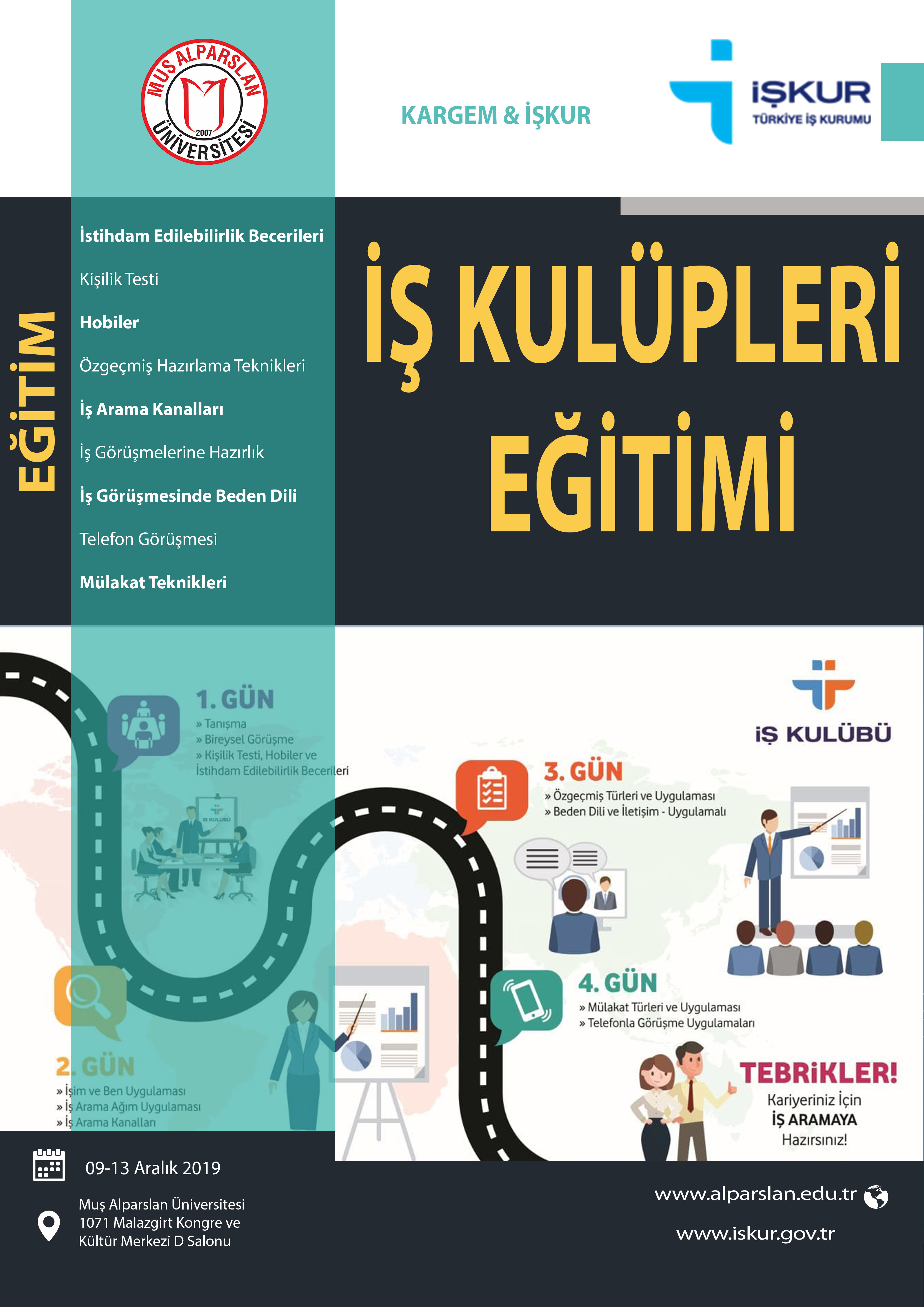 İş hayatına yeni adım atmaya hazırlanan, var olan bilgi ve birikimlerine yenisini eklemek isteyen adayların istihdam edilebilirlik becerilerini artırmak amacıyla Kariyer Geliştirme Uygulama ve Araştırma Merkezi  (KARGEM) ve Türkiye İş Kurumu Genel Müdürlüğü (İŞKUR) iş birliğiyle düzenlenen “İş Kulüpleri Eğitimi” başladı. Üniversitemiz 1071 Malazgirt Kongre ve Kültür Merkezi D Salonu’nda bugün başlayan eğitimler cuma gününe kadar sürecek. Her gün 13.00-17.00 saatleri arasında gerçekleştirilecek olan eğitimler kapsamında katılımcılar, kişilik testlerinden iş arama kanallarına; beden dilinden mülakat türlerine kadar geniş bir yelpazeyi kapsayan eğitimlerden yararlanacak.