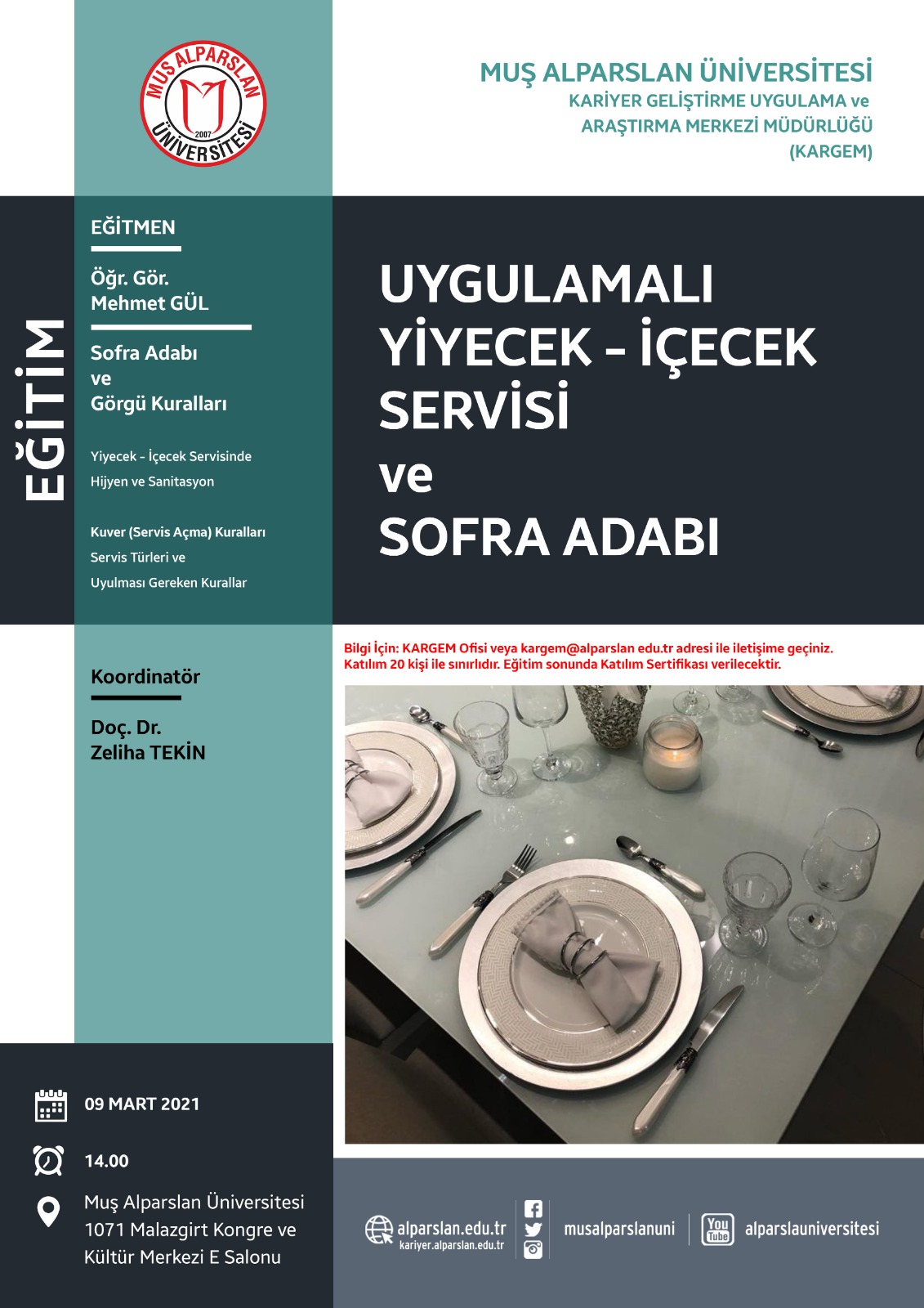 Koordinatörlüğü KARGEM Müdürü Doç. Dr. Zeliha Tekin tarafından yapılan eğitim Öğr. Gör. Mehmet Gül tarafından verildi. Eğitimde sofra adabı ve görgü kuralları, yiyecek-içecek servisinde hijyen ve sanitasyon, kuver (servis açma) kuralları, servis türleri ve uyulması gereken kurallar anlatıldı. Eğitim sonunda bir de servis açma yarışması ve peçete katlama uygulaması yapıldı. Eğitim, teşekkür belgesi ve sertifika takdimi ile sona erdi.