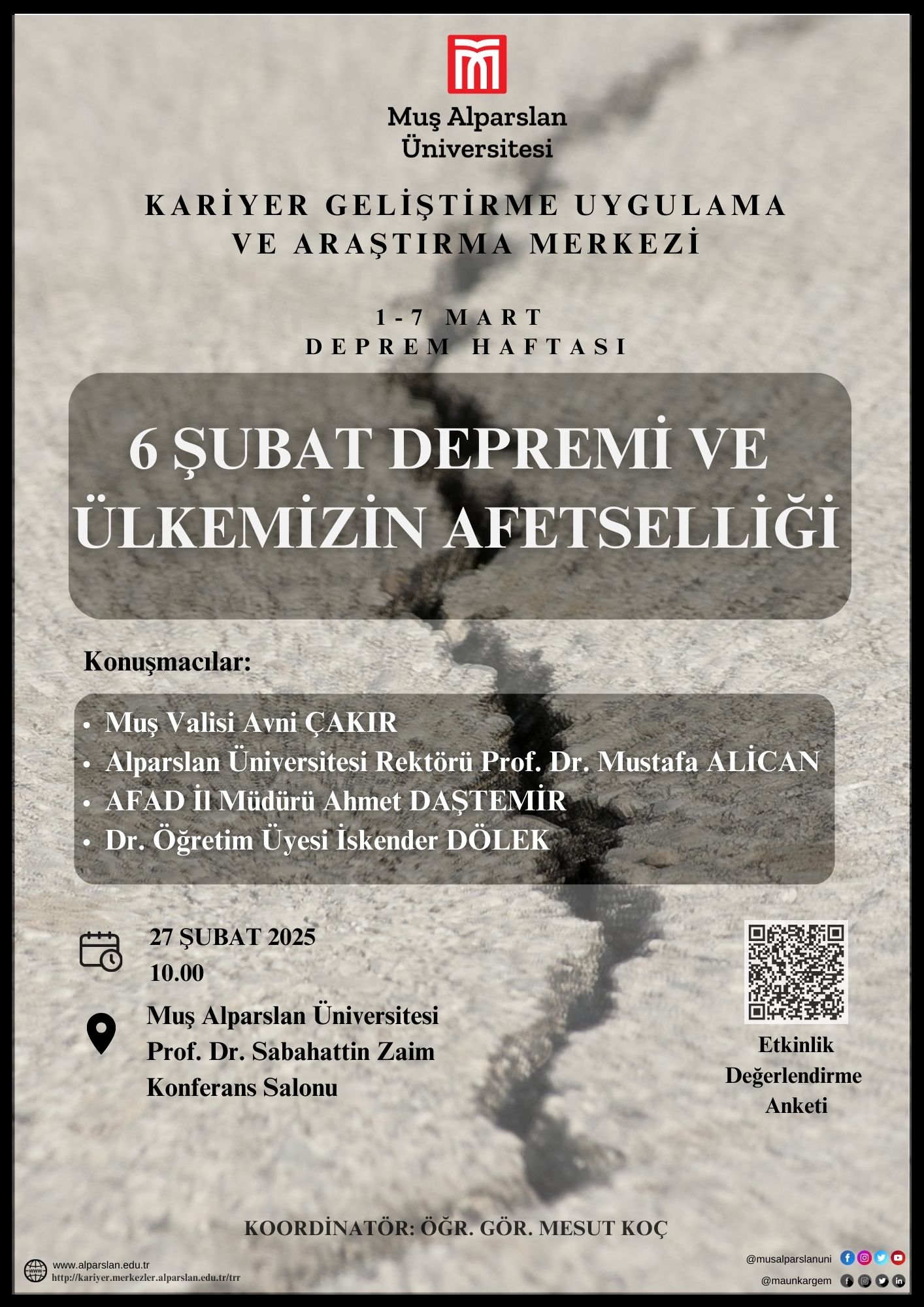 Prof. Dr. Sabahattin Zaim Konferans Salonu’nda düzenlenen etkinliğe Muş Valisi Avni Çakır, Rektörümüz Prof. Dr. Mustafa Alican, AFAD İl Müdürü Ahmet Daşdemir ve Dr. Öğr. Üyesi İskender Dölek konuşmacı olarak katıldı.