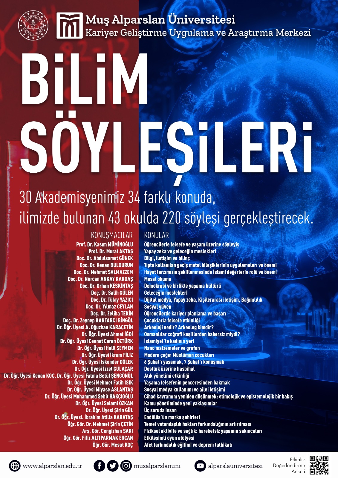 30 Akademisyenimiz 34 farklı konuda, ilimizde bulunan 43 okulda 220 söyleşi gerçekleştirecektir.