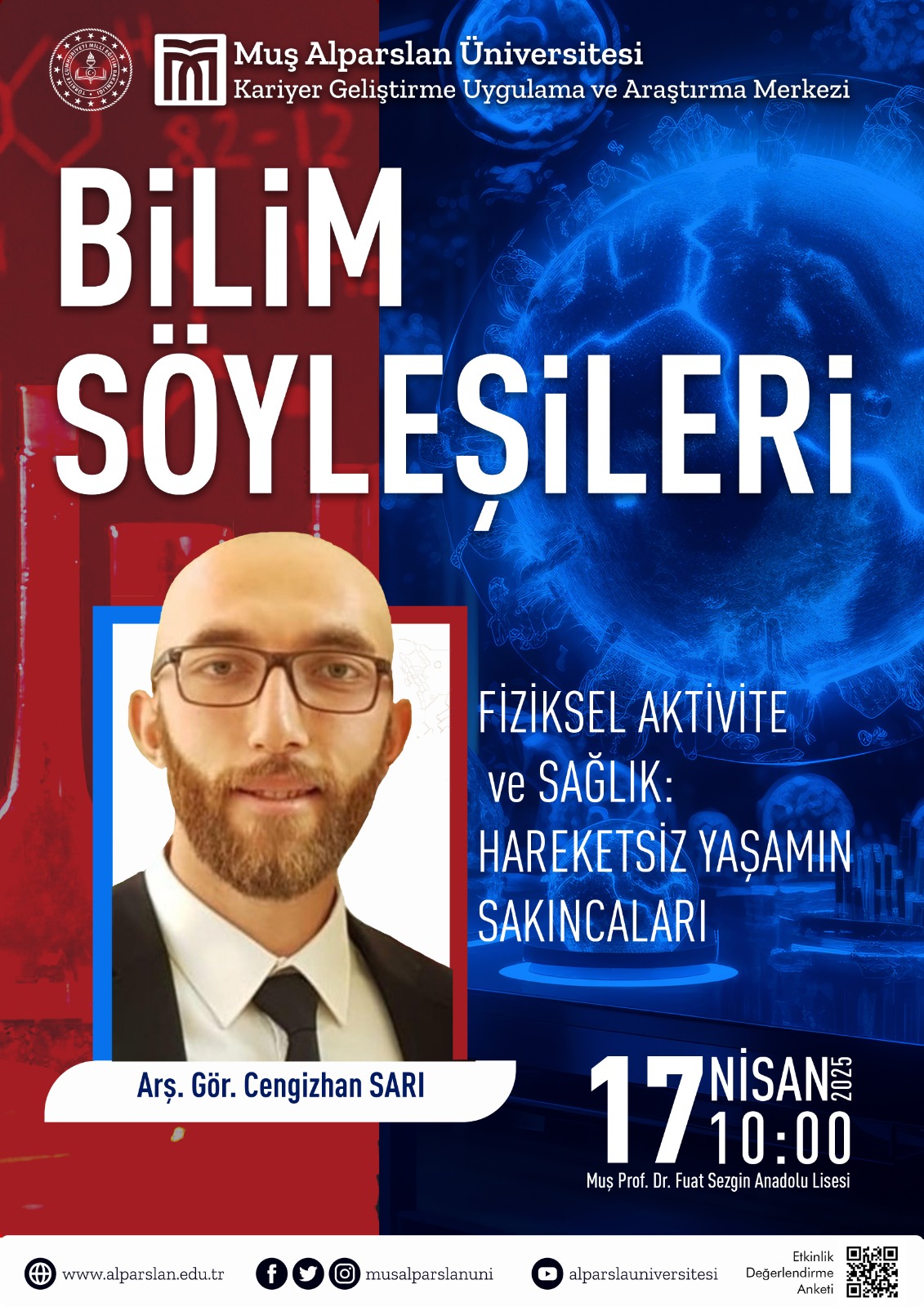 Muş Alparslan Üniversitesi Kariyer Geliştirme Uygulama ve Araştırma Merkezi ile Muş İl Milli Eğitim Müdürlüğü iş birliğinde yürütülen “Bilim Söyleşileri” programı kapsamında, 17 Nisan 2025 tarihinde Prof. Dr. Fuat Sezgin Anadolu Lisesi öğrencilerine yönelik “Fiziksel Aktivite ve Sağlık: Hareketsiz Yaşamın Sakıncaları” başlıklı bir söyleşi düzenlendi.