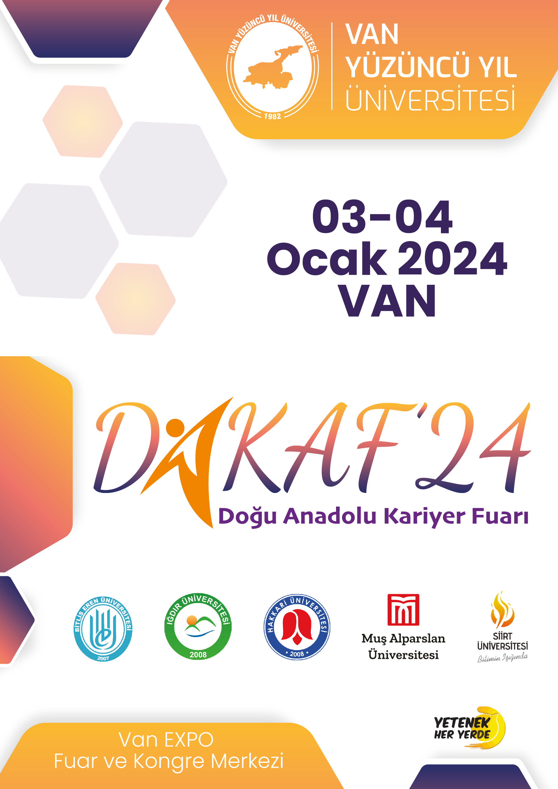 Cumhurbaşkanlığı himayelerinde, Cumhurbaşkanlığı İnsan Kaynakları Ofisi koordinasyonunda Van Yüzüncü Yıl Üniversitesi'nin ev sahipliği yapacağı, Bitlis Eren, Hakkari, Iğdır, Muş Alparslan ve Siirt Üniversitelerinin paydaş olduğu Doğu Anadolu Kariyer Fuarı (DAKAF'24), 03-04 Ocak 2024 tarihlerinde Van EXPO Fuar ve Kongre Merkezi'nde gerçekleştirilecektir.