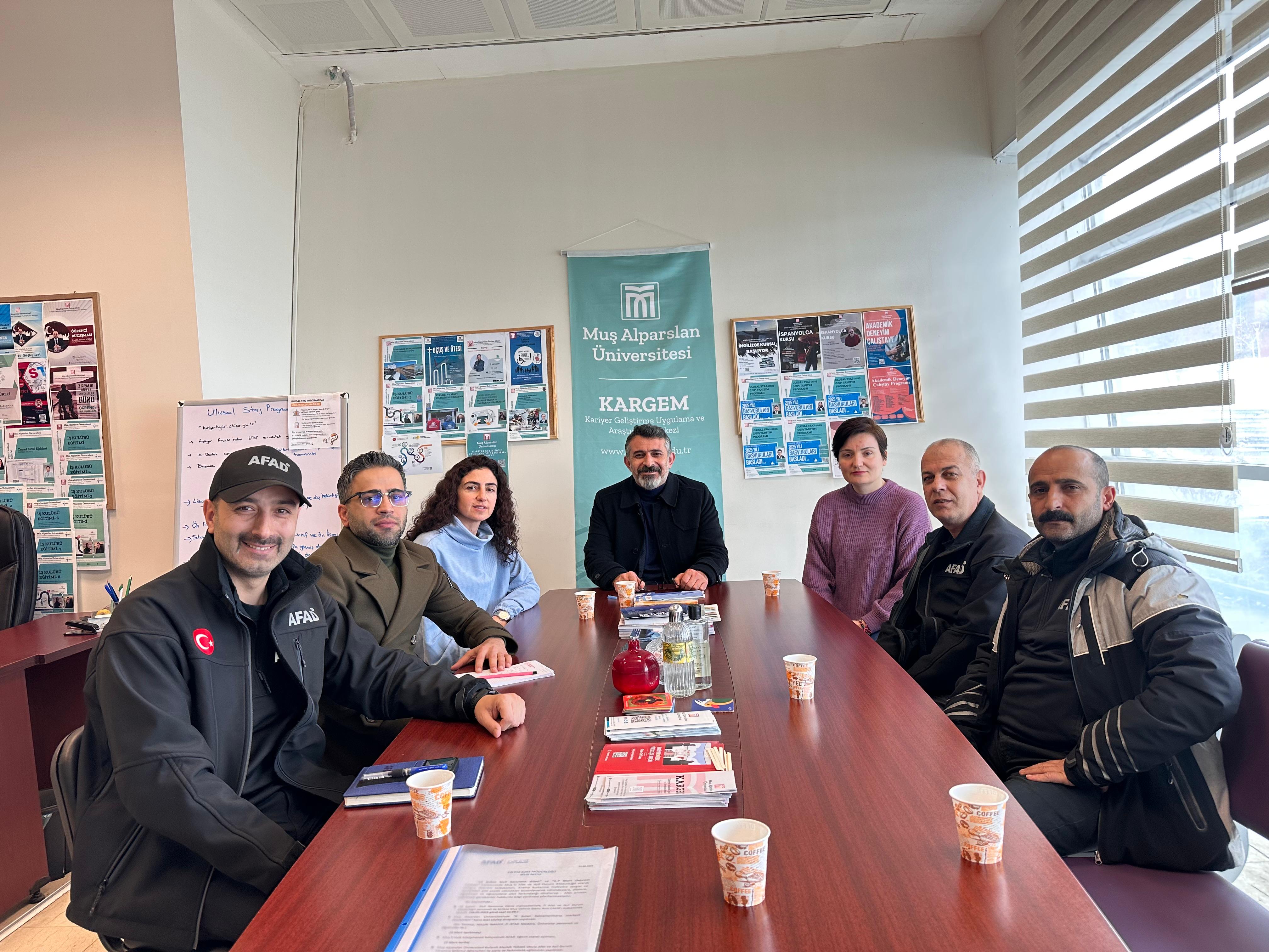 AFAD ekibi, Muş Alparslan Üniversitesi Kariyer Geliştirme Uygulama ve Araştırma Merkezi (KARGEM)'i ziyaret etti. Gerçekleşen ziyarette, KARGEM Müdürü Doç. Dr. Salih Gülen, KARGEM Müdür Yardımcısı Dr. Öğr. Üyesi Fatma Betül Şengönül, KARGEM Yönetim Kurulundan Dr. Öğr. Üyesi Miyase Aslantaş, Öğr. Gör. Mesut Koç ve idari personelimiz Ruken Ekici Baba yer aldı.